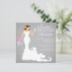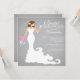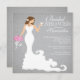 Stylish modern brunette bride wedding shower invitation features a chic modern bride toasting with a wine glass while holding a beautiful bouquet of pink wedding flowers set on a printed on paper popular grey grey linen background with stand out white text. Our modern bride bridal shower invitation is perfect for a popular wine bridal shower celebration. Visit our shop to view this beautiful bridal shower invitation in a large selection of floral bouquet colours and different bride variations.