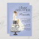 Start off your elegant bridal shower off right with our trendy Brunette bride bridal shower invitation featuring a classy Blonde bride sitting on a stylish damask 3 tier wedding cake set on a purple blue background. Just customise our invitation with your wedding shower information and you're all set to go. ©JW Illustrations