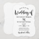A bold portrait wedding invitation with a decorative bracket die-cut shape featuring oversized black brush script "Wedding of" lettering on a clean white background. The playful yet modern typography pairs hand-lettered headers with clean serif details for a fresh, contemporary feel. All text is fully editable to personalise your celebration.