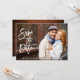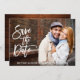 Modern Brush Script Save The Date Engagement Announcement Photo Card - White Script, Rustic Wood Back