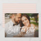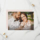 Announce your wedding in style with these modern save the date announcement cards that feature your engagement photo with a rustic brushed script overlay design on the front, along with a coordinating pattern of horizontal hand-drawn stripes on the back with a blush pink (can be modified) background colour. Includes simple wording that can be personalised with the important details. Note, the dark photo gradient filter can be removed.