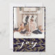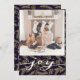Send customisable and personalised holiday greetings to friends, colleagues and family in simple, chic, elegant and modern photo design festive, natural minimalist style cards! A beautiful calligraphy of " joy " frames on bottom of your photo in front. Below the calligraphy features your custom greeting message from your family name in modern typography. Reverse to reveal a beautiful golden Christmas tree boughs in dark navy blue background.