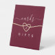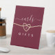 Elegant, simple red burgundy wedding tabletop sign with faux gold rope heart and modern calligraphy script.