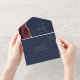 The left-hand edge of this elegant modern all-in-one wedding invitation and RSVP features a burgundy watercolor agate border trimmed with faux gold glitter. The customizable text combines gold-colored handwriting, copperplate and italic fonts on a navy blue background. The return address appears on the outside flap and the reverse side of the detachable RSVP card in gold-colored text on solid navy blue.