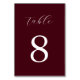 Create your own personalized wedding table number featuring modern minimalist typography on burgundy color background.