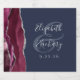 This modern wedding design features a burgundy red watercolor agate and silver faux glitter border on the left edge. Personalise it with the couple's names in elegant silver grey handwriting script over a large ampersand on a navy blue background, with the wedding date below.