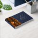 This elegant wedding guest book features a burnt orange watercolor agate design trimmed with faux gold glitter. Easily customise the real gold foil text on a navy blue background, with the names of the couple in whimsical handwriting calligraphy over a large ampersand. Add additional text of your choice to the front and spine.