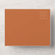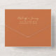The left-hand edge of this elegant modern all-in-one wedding invitation and RSVP features a gold faux glitter border. The customisable text combines gold-coloured whimsical handwriting, copperplate and italic fonts on a burnt orange background. The return address appears on the outside flap and the reverse side of the detachable RSVP card in gold-coloured text on solid burnt orange. A QR code is included on the RSVP card for guests who would prefer to reply online.