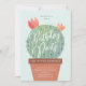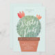 A whimsical kids birthday party invitation design by Stacey Meacham featuring original hand drawn watercolor prickly cactus illustration with bright floral buds in a