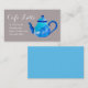 A cute modern style business card suitable for a café - either mobile café or coffee or tea shop. This whimsical design shows an illustration of a cute simple teapot modern style watercolor with grey background. The background colour can be changed to suit your taste. This business card is fully customisable to include your own personal details.