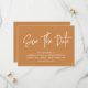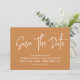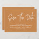 Modern calligraphy save the date with an earthy orange coloured background and a scannable QR code for a website or contact information on the back.