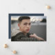 Modern calligraphy, black script photo overlay, photo graduation announcement. Backing colour shown in navy blue can be customised.