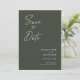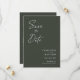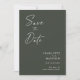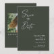 Modern, minimalist and elegant "Save The Date" wedding engagement photo cards. This custom design featuring elements of modern text with a unique calligraphy ink script. The couples photo highlights the back of the card. Colours are white writing on new olive green or easily customise the base colour as needed.