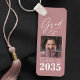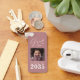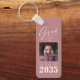 A trendy, new two sided, sturdy aluminium, Graduate keychain - keyring with your photo on the front. All Personalised, featuring "Grad" in elegant calligraphy ink script with "Class of, The Year, School Name & Your Name" in modern typography. The graduate's photo is artfully accented with a delicate gradient boarder. The text and trim are white with the background in a dusty rose blush colour. If you wish, easily edit the background colour to your school's primary colour. The perfect Graduation gift idea for high school, college and university students.