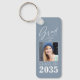 A trendy, modern two sided, sturdy aluminum, Graduate keychain - keyring with your photo on the front. All Personalized, featuring "Grad" in elegant calligraphy ink script with "Class of, The Year, School Name & Your Name" in modern typography. The graduate's photo is artfully accented with a delicate gradient boarder. The text and trim are white with the background in a chic dusty blue color. If you wish, easily edit the background color to your school's primary color. The perfect Graduation gift idea for high school, college and university students.