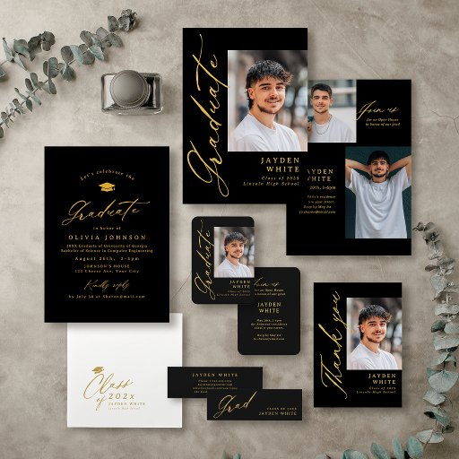 Modern Calligraphy Graduation invitation with graduation cap and photos in front and back, simple and unique. Custom it with your own photos and grad party information.