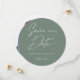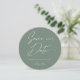 Modern classy calligraphy circle save the date card with minimal text on the front on a trendy sage green background and your image of choice on the back. Customise this round save the date card it with your own photo, names, wedding date and location and make it uniquely your own. All colours (text and background) are customizeable too.