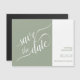 These save the date cards are simple, modern, minimalist, and elegant. They feature a contemporary two pane design. The sage green panel on the left has script calligraphy reading "save the date." The panel on the right has your names, the wedding date, and location in a trendy right justified layout. Beautiful way to help your friends and family remember your upcoming special day.