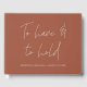 Cherish your memories with this wedding guestbook featuring the wedding vow "To have and to hold" in sophisticated minimalist calligraphy script design - simple and elegant. This is a great wedding guest book for any minimal and modern wedding. You can change the colour of the script font to any colour you like and customise this guest book with your own names and date on front and spine. Default background is Terracotta but you can change the background colour in the design tool too.