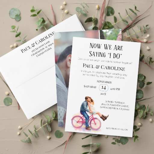 Celebrate love on wheels with this romantic engagement invitation featuring a watercolor illustration of a couple on a pink bicycle. This modern and casual design is perfect for outdoor or country-style engagement parties. Customise the text with your names, date, time, and RSVP info. Ideal for those who want a fresh and heartfelt announcement with a touch of whimsy.