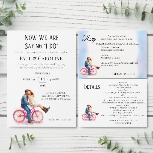 Celebrate love on wheels with this romantic engagement invitation featuring a watercolor illustration of a couple on a pink bicycle. This modern and casual design is perfect for outdoor or country-style engagement parties. Customise the text with your names, date, time, and RSVP info. Ideal for those who want a fresh and heartfelt announcement with a touch of whimsy.
