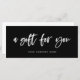 This modern small business gift certificate features white trendy casual script typography that says "a gift for you," on a dark black background.