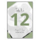 Theme Parties' modern casual wedding table number design in sage green features an angled photo cutout and your favourite engagement photo as the back drop to your wedding invitation, giving your invitation modern geometric style. Your engagement photo is automatically converted to black and white and repeated on the reverse side. The design is accented with hand-lettered typography paired with modern block text. #MinimalistWedding #ModernWedding #CasualWedding