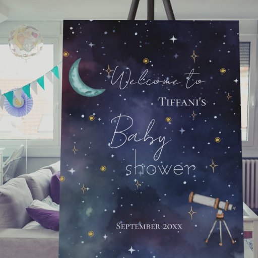 Set the celestial tone for your baby shower with our Modern Celestial Moon & Stars Invitation. Against a serene blue watercolor starry night backdrop adorned with white stars, a whimsical light blue moon, golden yellow stars and a telescope, this invitation invites guests to a magical celebration under the night sky. Elevate your baby shower with this enchanting and stylish invitation.