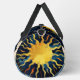 Encircling the sun is an array of stars and celestial bodies, meticulously detailed in shades of white, grey, and yellow. These stars create a harmonious celestial scene, adding depth and a touch of magic to the duffel bag. The intricate placement of each star enhances the overall aesthetic, making this bag a standout piece for those fascinated by the wonders of the universe.