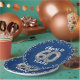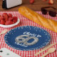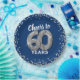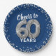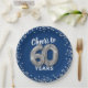 Elegant sixtieth birthday party paper plates featuring a trendy blue background that can be changed to any colour, silver sparkly glitter, and the saying "cheers to 60 years" using sixty silver hellium balloons.