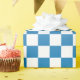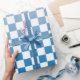 Modern light to dark blue gradient and white chequered pattern adds a stylish accent to your presents.