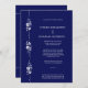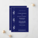 This modern wedding invitation features a deep navy blue background paired with crisp white typography for a clean, elegant look. A vertical decorative panel along one side showcases a minimalist floral motif with stylized blossoms, flowing vines, and dotted accents, adding a touch of romance without overwhelming the design. The layout is airy and well-balanced, with contemporary sans-serif lettering and a refined ampersand that gives the invitation a sophisticated, upscale feel. Overall, the design blends modern simplicity with subtle floral elegance, making it suitable for a classic yet contemporary wedding celebration. The RSVP info is included for brides on a budget. If you would like a separate RSVP, please send me a message.