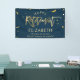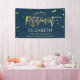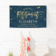 Modern Happy Retirement Custom Name Banner with festive printed gold confetti Illustrations on dark teal blue. Personalise with your name and another 1 or 2 lines of custom text as well as the option to change the background to another colour in the design tool under "customise further".