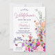 A little wildflower is on the way! Elegant modern spring summer flowers illustration with pretty wild flower and brush script baby shower party invitation with a modern calligraphy typography with red, purple, pink , terracotta flowers on white