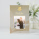 Modern beige abstract art Chinese wedding thank you card with a gold double happiness symbol and a bride and groom photo at the front site. At the back site is a custom thank you text in an elegant handwritten script and a modern sans serif font.