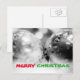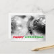 Modern Christmas holiday postcard with the words "Merry Christmas" in red and green and a black and white art photograph of Christmas glass ornaments.