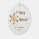 Merry & Bright typography with gold copper snowflake white Christmas tree ornament personalised with your photo, family name and year.