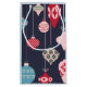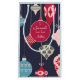 Modern and stylish personalised Christmas gift bag with dangling tree ornaments pattern on navy blue background.