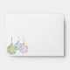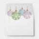 This envelope features three non-traditional colour Christmas ornaments in pastel green, pink, and blue with white stars on the lower right front. Four ornaments are on the inside and seen when the envelope is opened. Click personalise to add text.