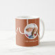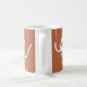 This modern Christmas mug is decorated with the word JOY on a rust background.