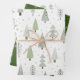 A collection of three coordinated sheets of wrapping paper featuring a pattern of modern, abstract Christmas trees and forest trees in snow in sage green, olive green and white. ASSISTANCE: For help with design modification or personalisation, colour change, resizing, transferring the design to another product or if you would like coordinating items, contact the designer BEFORE ORDERING via the Zazzle Chat MESSAGE tab below or email makeitaboutyoustore@gmail.com.