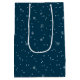 Modern, personalised Christmas holiday gift bag with cute snowflake and snow patterns in white with dark blue background. The sample is shown in the MEDIUM size--other sizes are available on the ordering page. ASSISTANCE: For help with design modification or personalisation, colour change, resizing or transferring the design to another product, contact the designer BEFORE ORDERING via the Zazzle Chat MESSAGE tab below or email makeitaboutyoustore@gmail.com.