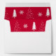 Design features white Christmas trees and snowflakes against red background. Happy Holidays!
