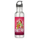 Water bottles with a cool Christmas illustration. The text says Merry Christmas & Happy New Year. Designed with a tree shaped mound of presents with festive snowflakes, stars, christmas baubles and glowy looking sparkles. The background is a vibrant reddish pink colour.