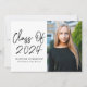 Modern graduation party invites featuring "Class of 2024" in a black handwritten script on a white background. Personalize the front of the graduation invite by adding the graduate's name, school name, and vertical photo. The invite reverses to display your graduation party details in white lettering on a black background.
