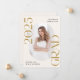 Announce the graduate's big achievement in style with this modern photo graduation announcement. The trendy design features "Class of 2025 Grad" in bold gold lettering with subtle script accents with a solid cream background. The graduate's vertical photo is displayed inside an oblong frame at the centre of the announcement. Personalise the front of the cream and gold graduation announcement with the graduate's name and school. The announcement reverses to display an additional photo displayed inside of a square frame with your custom text shown below. The stylish graduation announcement is perfect for high school and college graduates.