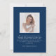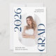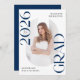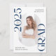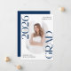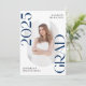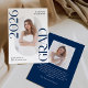 Announce the graduate's big achievement in style with this modern photo graduation announcement. The trendy design features "Class of 2025 Grad" in bold navy lettering with subtle script accents with a solid white background. The graduate's vertical photo is displayed inside an oblong frame at the centre of the announcement. Personalise the front of the navy graduation announcement with the graduate's name and school. The announcement reverses to display an additional photo displayed inside of a white square frame with your custom text shown below. The stylish graduation announcement is perfect for high school and college graduates.