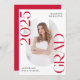 Invite family and friends to celebrate the grad with these stylish photo graduation party invitations! The trendy design features "Class of 2025 Grad" in bold red lettering with subtle script accents with a solid white background. The graduate's vertical photo is displayed inside an oblong frame at the centre of the invitation. Personalise the front of the red graduation invitation with the graduate's name and school. The invite reverses to display your graduation party details in white with a red background. This grad party invite is perfect for high school and college graduates.