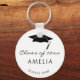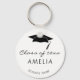 Modern and Simple Black & White Class of Graduation Keychain with a graduate name, school name and black graduation cap. The trendy black script is on white background. Personalize the keychain and make a great personalized gift and keepsake for a graduate.