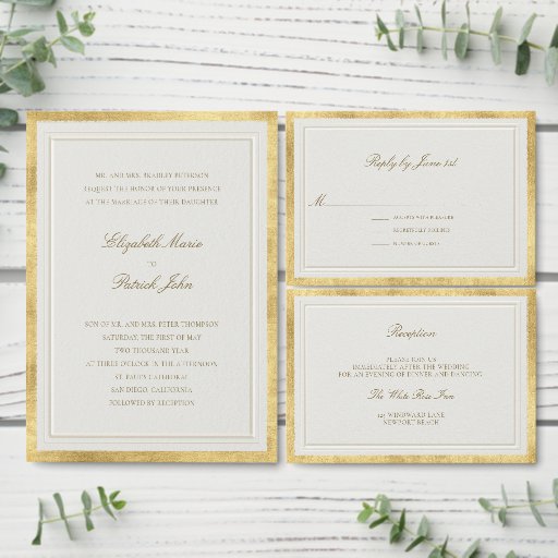 Announce your wedding with timeless sophistication using this Elevated Faux Gold Wedding Save the Date, featuring a beautifully refined double frame that adds graceful structure and depth. Designed on a soft, ecru background with a delicate watercolor paper texture, this piece evokes classic elegance and understated luxury.